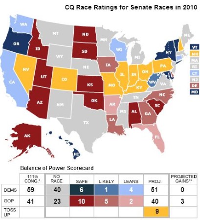 Mit einem fulminanten Sieg von 70 zu 27 Prozent errang 2004 der bis dato gänzlich unbekannte Demokrat Barack Obama den vakanten Senatssitz seines Heimatstaates Illinois und betrat damit die bundespolitische Ebene. Nach nur zwei, drei Jahren im Amt begann er seine Präsidentschaftskandidatur vorzubereiten. Der durch seine Wahl frei gewordene Senatssitz war 2009 vom demokratischen Gouverneur von Illinois mit Roland Burris besetzt worden, wobei öffentlich wurde, dass Gouverneur Rod Blagojevich offenbar den Senatssitz meistbietend versteigert hatte. Burris bewirbt sich allerdings bei den Wahlen 2010 nicht mehr. In Illinois findet neben Nevada und Kalifornien der wichtigste Wahlkampf für die Demokraten statt. Als Kandidaten aus den Primaries gingen bei den Demokraten mit nur 5 Prozent Vorsprung vor den anderen Kandidaten Alexi Giannoulias und bei den Republikanern Mark Kirk hervor. Giannoulias zeichnet als State Treasurer für die Finanzen von Illinois verantwortlich, der Bundesstaat, der nach Kalifornien die größten Finanzschwierigkeiten hat, zudem ging Giannoulias Familienbank erst unlängst pleite und wurde mit 400 Millionen Dollar an Bundesgeldern gerettet; beides ist nicht unbedingt Image fördernd, doch das versucht er mit prominenter Unterstützung wettzumachen: Anfang August sammelte Präsident Obama, mit dem Giannoulias laut New York Times auch Basketball spielt, persönlich Spenden für diesen, um den wahlkämpfenden Parteifreund zu unterstützen. Der Republikaner Kirk, fünffach wiedergewählter Abgeordneter des 10. Wahldistrikts von Illinois, gilt in sozialen Fragen als einigermaßen moderat, machte keine größeren Schlagzeilen und hat bis dato fast dreimal so viele Spendengelder eingesammelt wie sein demokratischer Konkurrent. Die Republikaner mobilisieren mächtig, denn schließlich wäre ein Sieg gleich ein zweifacher Triumph, weil Illinois eigentlich ein originär demokratischer Staat ist und Obamas ehemaliger Senatssitz eine besondere Trophäe darstellen würde.
