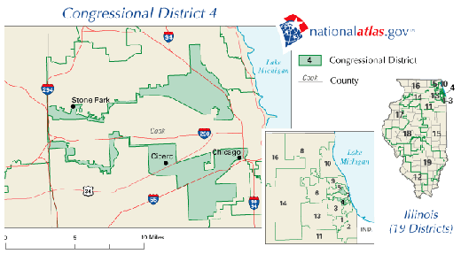 Das Gerrymandering-Prinzip ist übrigens nach höchstrichterlicher Entscheidung so lange legal, wie die Einteilung aus politischen Gründen erfolgt und dadurch keine Rassendiskriminierung erfolgt, wobei gerade bei Illinois 4 auffällt, dass mit dem Zuschnitt des Wahlkreises zwei innerstädtische Gebiete im Großraum von Chicago zusammengefasst wurden, in denen bevorzugt latinostämmige Wähler wohnen.